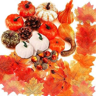 FEPITO Automne Thanksgiving Décorations, Mini citrouilles artificielles, cônes de pin, Feuilles d'automne, Glands pour décorations de fête d'automne, Kit de décoration d'automne Halloween Fournitures