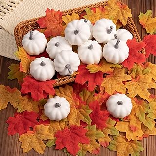 Whaline Lot de 12 citrouilles artificielles en mousse avec 100 feuilles d'érable - Mini citrouilles blanches artificielles pour récolter l'automne - Pour Halloween, mariage, décoration de la maison