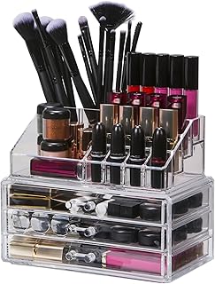 Organised Beauty 2 Piece Clear Acrylic Makeup Storage/Jewellery/Cosmetic/Nail Polish/lipstick Organiser Display Stand 3 Drawers |19 Sections | High Grade 3mm Acrylic